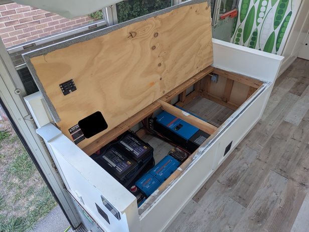 We opted to keep the system installation location under the couch. We used 75% of the space for the power equipment, while leaving the remaining 25% free for a hidden litter box compartment to be installed in the future for the owner's cat! After removing the existing batteries, we were able to strategically fit three lithium iron phosphate batteries (with room for a fourth), a 5,000VA inverter/charger, and all the other necessary converters and chargers. Two temperature controlled fans were also installed to make sure the equipment gets adequate airflow. The 120VAC wiring was redone; upgrading the input wire size and circuit breakers. Additional receptacles were installed and wiring issues were fixed with the existing outlets.