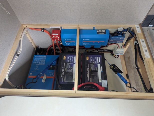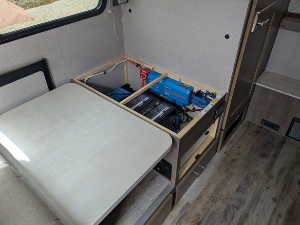 Two 48V lithium iron phosphate batteries were installed to replace the two 12V lead-acid batteries. They were also relocated from their previous location to under the dining table bench. The layout was designed to accommodate an additional battery in the future if needed, without having to rearrange anything or remake any of the existing wires. A 48V to 12V buck converter was installed to allow for normal usage of the camper's 12V system.